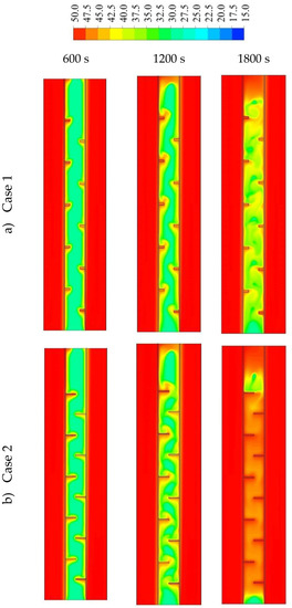 Figure 11 shows the temperature distribution in the PCM domain during the 1800 s for all the cases. With the short fins (case 1), the temperature distributed uniformly but in slow steps. The warmer region gathered at the top and the cold portions collected at the bottom; this is because, in the case of short fins, the liquid phase had wider free space to move due to the natural convection. Within 1800 s, the average temperature reached 39.5 °C in the whole domain. Using longer fins (case 2: 1 × 10 mm2) helped the temperature to rise over all the domains, due to the large surface area of the heat transfer. In this case, the liquid phase had relatively enough space to circulate in the domain due to natural convection. The average temperature in the domain reached 47 °C in 1800 s. For case 3 (0.666 × 15 mm2), as mentioned previously, the PCM was restricted between the two neighbor fins with a narrow gap between the fin and the opposite wall. The heat transferred faster due to the large surface area of the fins; however, the length of the fins limited the circulation through the entire domain. On the other hand, circulation generated in the area between the two neighbor fins. The average temperature in the entire domain was 47.2 °C. The areas between the fins almost reached the thermal equilibrium with the HTF temperature. However, for the upper part, the PCM received heat from the lower fin and the upper fins were missing because of the wall, which caused a solid portion to remain at the top section of the domain.
