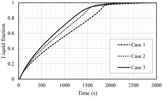 The liquid fraction development for the total PCM for the cases (case 1 (2 × 5 mm2), case 2 (1 × 10 mm2) and case 3 (0.666 × 15 mm2)).