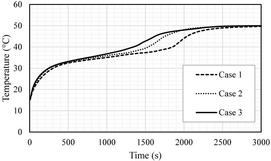 The temperature profiles for the total PCM for the cases (case 1 (2 × 5 mm2), case 2 (1 × 10 mm2) and case 3 (0.666 × 15 mm2)).