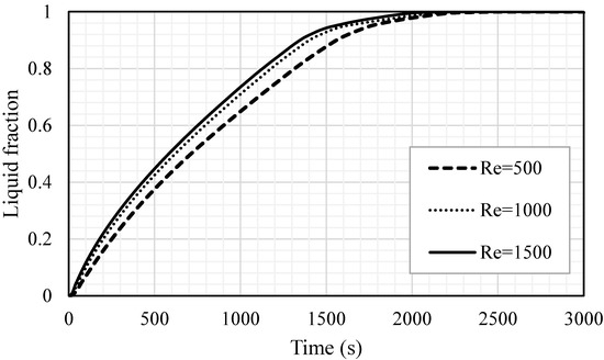The liquid fraction development for the whole PCM for various values of Re (Re = 500, Re = 1000 and Re = 1500).