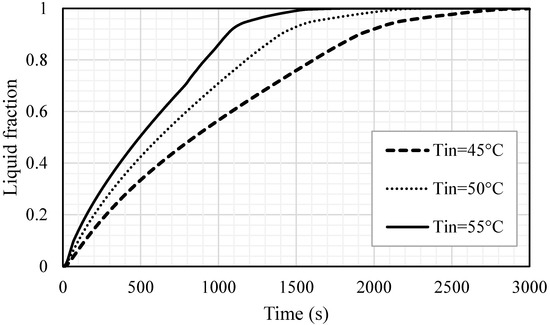 Liquid fraction development for the whole PCM for different cases of HTF inlet temperatures (Tin = 45 °C, Tin = 50 °C and Tin = 55 °C).