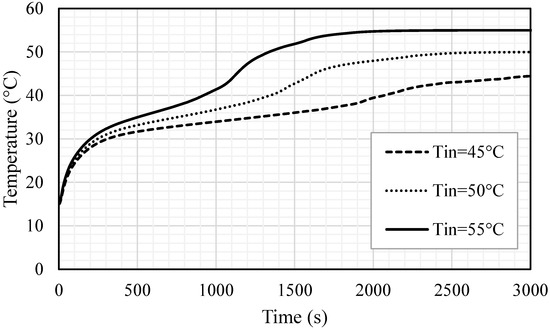 The impacts of the inlet temperature on the melting process are also here examined for the optimum case. Three different temperatures, 45, 50, 55 ℃, were used for this analysis. Figure 17 shows that the liquid fraction is significantly influenced by the change in the inlet temperature of the HTF and the melting time is inversely proportional to the inlet temperature. A higher inlet temperature caused a great temperature difference between the bulk on the wall; consequently, more heat transfer from the HTF to the PCM resulted in a faster charging process. The melting time diminished by 783 s and 1342 s, when the inlet temperature increased from 45 °C to 50 °C and 55 °C, respectively. The inlet temperature of the HTF expectedly reached the mean temperature of the PCM and the PCM reached a higher temperature utilizing the warmer HTF, achieving the thermal equilibrium with the HTF sooner. When the inlet temperature was 55 ℃, the PCM achieved the thermal equilibrium within 2000 s; however, the time increased to 2500 s and 3000 s when the inlet temperatures were 50 and 45 ℃, respectively (shown in Figure 18). This behavior is caused by a higher temperature difference, which causes more thermal exchange between the HTF and PCM and results in reaching the thermal equilibrium faster, in the case of the highest HTF temperature. Table 4 demonstrates the impacts of the inlet HTF temperature on the melting process. The total melting time was reduced by 42.2% and 24.6% when the inlet temperatures used were 55 °C and 50 °C, respectively, compared with the melting time when the inlet temperature was 45 °C, which is 3179 s. The charging power also improved by 88.4% and 38.5%, when the inlet temperatures were 55 °C and 50 °C, respectively, compared with the melting power when the inlet temperature was 45 °C, which is 50.7 W.