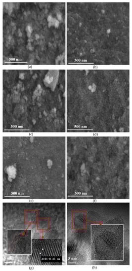 SEM of (a) T-V, (b) U-T-V, (c) T-He, (d) U-T-He, (e) T-N2, and (f) U-T-N2, as well as (g,h) HR-TEM of T-V.