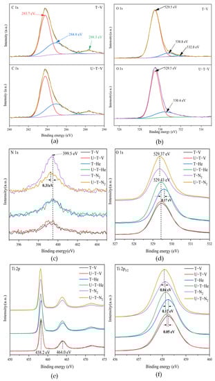 High-resolution XPS of (a) C 1s of T-V and U-T-V; (b) O 1s of T-V and U-T-V; (c) N 1s; (d) O 1s; (e) Ti 2p; (f) enlarged Ti 2p3/2 of the as-prepared samples.
