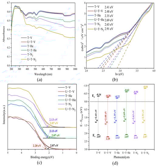 (a) UV-vis spectral absorbance; (b) bandgap energies evaluated from the plots of (αhν)2 versus hν; (c) XPS valence band (VB) spectra; (d) the calculated band energy.