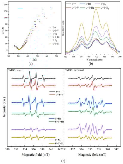 Figure 5a shows EIS Nyquist plots for all of the samples. The relative sizes of circular arc radii correspond to the charge transfer resistance and separation efficiency of photo-induced electrons and holes [44]. The relative arc sizes are in the following order: U-T-V > T-V > T-He. The other three samples exhibited similar but smaller arc sizes. The sample U-T-V showed the smallest circular arc radius, indicating that it has the highest electron-hole pair separation and electron transfer efficiency to electron donor/acceptor. Figure 5b shows the PL emission spectra of all the samples in the range of 430–500 nm with an excitation wavelength of 365 nm, resulting from the recombination of free carriers. The excitonic PL resulted from surface OVs and defects of the samples. All the emission spectra shapes are similar, and three main emission peaks are located at 451, 469, and 482 nm, respectively. The peaks at 451 and 469 nm are attributed to band edge free excitons, and the peak at 482 nm is attributed to bound excitons [45]. The intensity of the peak at 469 nm reached the summit of the survey spectrum, demonstrating the formation of OVs in the lattice of the samples [46]. The samples annealing under the N2 atmosphere showed the highest emission intensity. T-V, U-T-V, and T-He exhibited similar but lower emission intensities, indicating a reduced recombination rate of photogenerated electrons and holes in the above three samples. The results agreed well with the results of the EIS test shown in Figure 5a. T-V, U-T-V, and T-He displayed faster interfacial charge transfers and lower charge recombination rates, which are the basic benefits of higher photocatalytic activities.