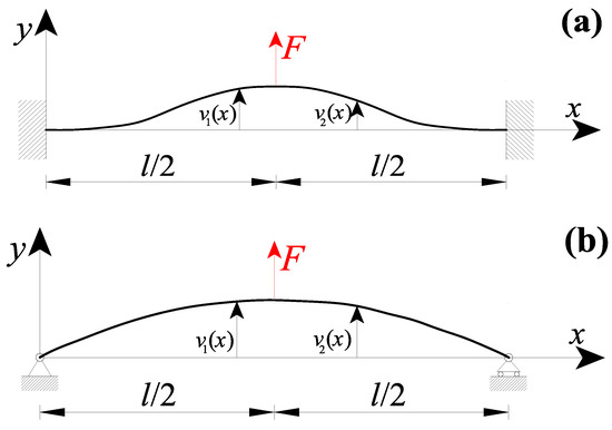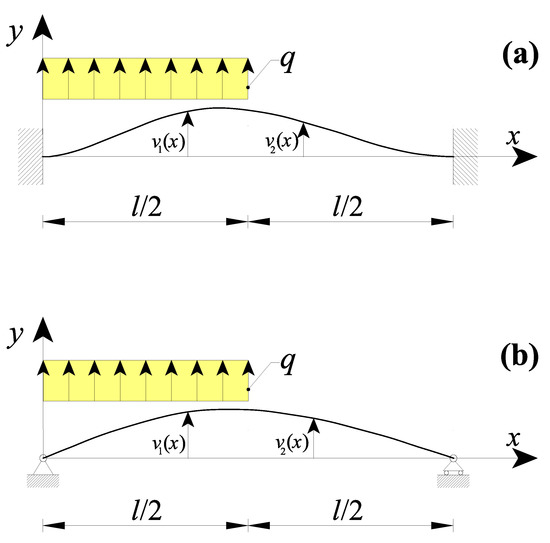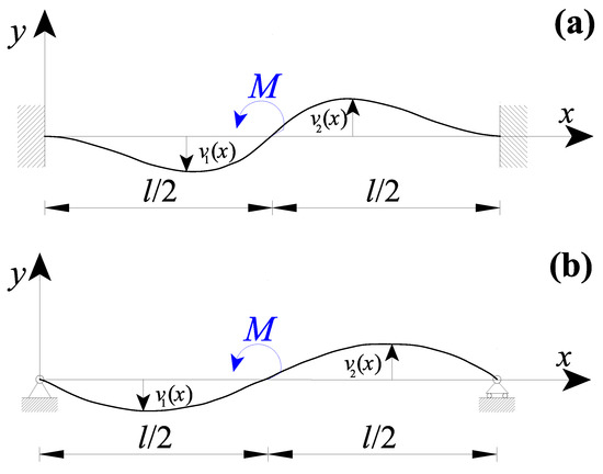 Due to the particular loading configuration, , whereas . Consequently, by equating the two bending moments of Equation (24a,b) for , the SBC of Equation (23b) can be obtained.