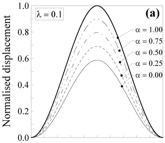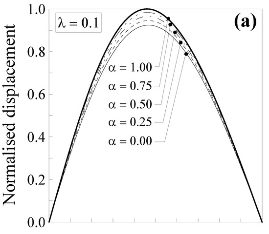Such a normalised displacement is plotted in Figure 6 against the dimensionless abscissa for the five values of the mixture parameter (that is, α = 0.00, 0.25, 0.5, 0.75 and 1.00) and two values of the dimensionless characteristic length, that is, (Figure 6a) and (Figure 6b).