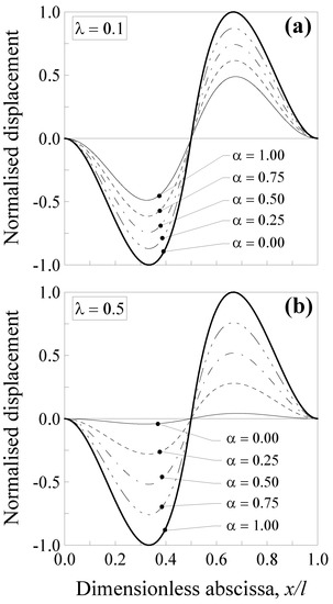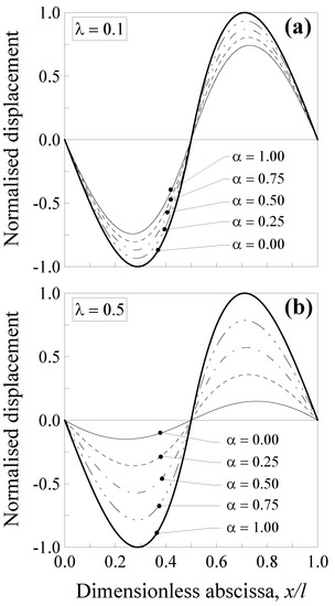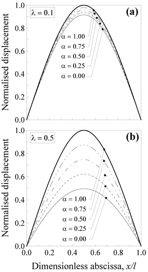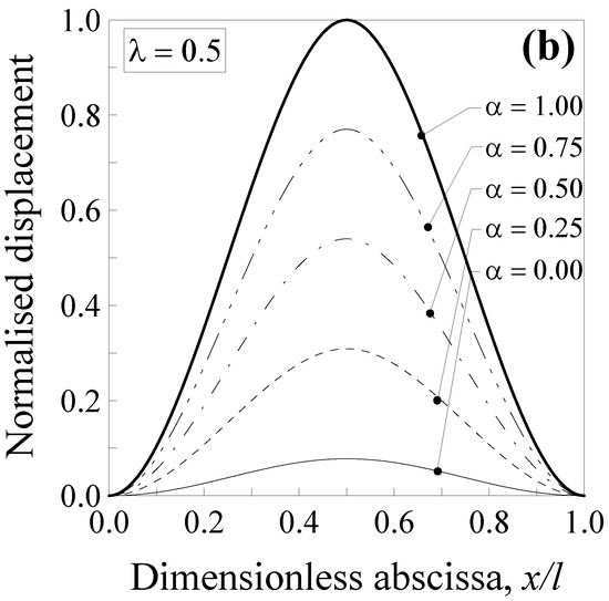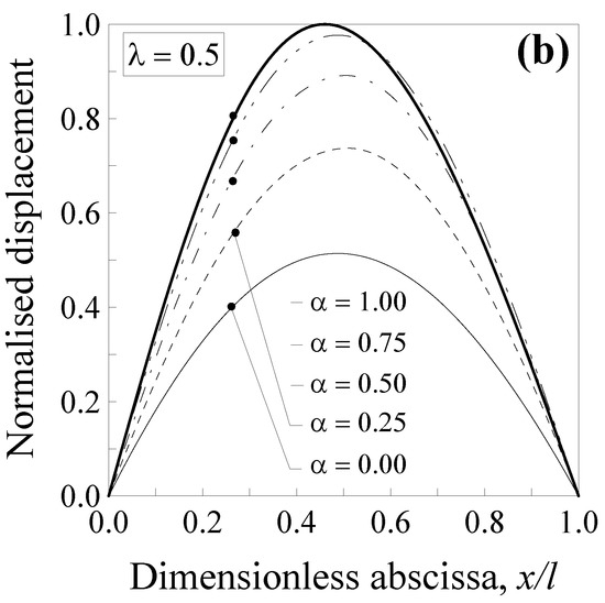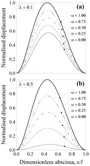 Additionally, in this case, the transversal displacement is normalised with respect to the maximum deflection according to the classical local Bernoulli–Euler solution, that is, and . Such a normalised displacement is plotted in Figure 4 against the dimensionless abscissa for five values of the mixture parameter (that is, α = 0.00, 0.25, 0.5, 0.75 and 1.00) and two values of the dimensionless characteristic length, that is, (Figure 4a) and (Figure 4b).