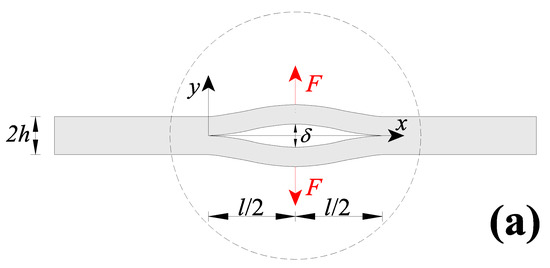 In the present section, a centrally-cracked nanobeam (CCN) was considered. The CCN, with a rectangular cross-section with thickness, , and width, , contains a central crack with length, , and is subjected to a pair of concentrated forces at the half crack length (Figure 11a).