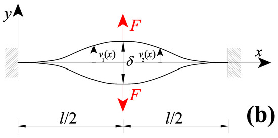 Figure 2a shows a nanobeam of a length l with clamped extremities and subjected to a concentrated force in the midsection (i.e., ). According to the equations presented in the above section, the nanobeam transversal displacement may be obtained by considering, in addition to both Equation (16a,b) (CBCs) and Equation (17a,b) (CCCs), the following conditions: