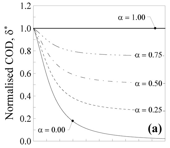 As can be observed, the normalised COD, , decreases by increasing the value of for all the considered values of the mixture parameter, with the exception of (thick line), for which (local Bernoulli–Euler problem). The nanobeam also behaves like a large scale beam when , whereas the effect of nonlocality is maximum when and (thin continuous line), with a maximum decrease in the COD equal to about 95%, corresponding to the case of the full nonlocal model. Consequently, it is possible to observe that in a centrally-cracked nanobeam, the crack is less open than in a large-scale one.