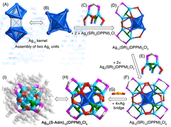 - Kang, X.; Zhu, M. Intra-Cluster Growth Meets Inter-Cluster Assembly: The Molecular and Supramolecular Chemistry of Atomically Precise Nanoclusters. Coord. Chem. Rev. 2019, 394, 1–38. [Google Scholar] [CrossRef]