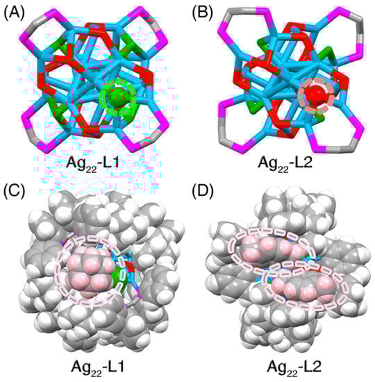 (ii) For the surface environment: the biggest structural difference between the two Ag22 nanoclusters lay in their surface ligand environments in terms of the proportion of the chlorine in peripheral ligands. Specifically, the Ag22-L1 nanocluster contained 10 thiol and 6 chlorine ligands, while Ag22-L2 included 12 thiol and 4 chlorine ligands (Figure 2). As shown in Figure 2A,B, a thiol ligand at the specific location on the Ag22-L2 surface was substituted by a chlorine ligand in Ag22-L1. Another thiol ligand at the symmetrical position was also replaced by chlorine. Such a substitution from bulky thiol to small-steric chlorine was reasonable by considering that the more compact surface environment on Ag22-L1, resulting from the bulkier DPPM and S-Adm ligands relative to DPPE and S-PhMe2, was unable to host as many bulky thiol ligands as Ag22-L2 (Figure 2C,D). Moreover, several intramolecular noncovalent C-H···π and π···π interactions were observed in the Ag22-L2 structure, which was advantageous to the compact packing of its surface ligands [54]. By comparison, none of such noncovalent interactions was observed in Ag22-L1, which might be another reason that more small-steric chlorine but fewer bulky thiol ligands were arranged on the Ag22-L1 nanocluster surface.