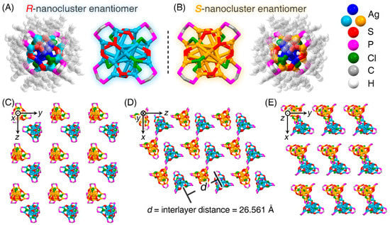 Crystalline packing of the Ag22-L1 nanocluster molecules. (A) Structure of the R-nanocluster enantiomer. (B) Structure of the S-nanocluster enantiomer. (C–E) Packing of the Ag22-L1 molecules in the crystal lattice: view from the x axis (C), y axis (D), and z axis (E). The inter-layer distance along with the z axis is 25.561 Å. Color codes: blue/light blue sphere, Ag in R-nanocluster enantiomer; blue/orange sphere, Ag in S-nanocluster enantiomer; red sphere, S; magenta sphere, P; green sphere, Cl; grey sphere, C; white sphere, H.