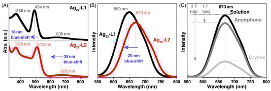 Comparison of optical properties between two Ag22 nanoclusters. (A) Comparison of optical absorptions between Ag22-L1 (black line) and Ag22-L2 (red line). (B) Comparison of emissions between Ag22-L1 (black line) and Ag22-L2 (red line). (C) Emission spectra of Ag22-L1 in the solution (black line), amorphous (red line), and crystalline (blue line) states.