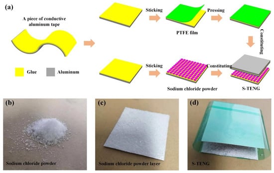 (a) The detailed preparation process of S-TENG using aluminum taper, PTFE film and sodium chloride powder. The photograph of (b) sodium chloride powder, (c) sodium chloride powder layer and (d) S-TENG.