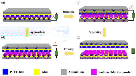The S-TENG can work under vertical motion conditions, and the operating mechanism of S-TENG is shown in Figure 2. Generally, the PTFE film can obtain electrons from other triboelectric materials during the triboelectric process. Thus, when PTFE film contact with the sodium chloride powder layer, the PTFE film surface will obtain electrons, and the sodium chloride powder layer will lose the same amount of electrons due to the contact electrification mechanism, as shown in Figure 2a. Then, when the surfaces of the PTFE film and sodium chloride powder layer separate (Figure 2b), the top electrode of the S-TENG device will generate a positive charge, and the electrode at the bottom of the S-TENG will produce the same amount of negative charge. In addition, this can lead to the generation of pulse current in the external circuit. When the maximum separation distance reaches a certain value, the charge transfer between the two electrodes reaches the saturation state. Furthermore, the circuit will not produce pulse current, as shown in Figure 2c. when the PTFE film surface is close to the sodium chloride powder layer surface, the negative charge at the top electrode will be transferred to the bottom electrode, and a reverse pulse current will be formed, as shown in Figure 2d.