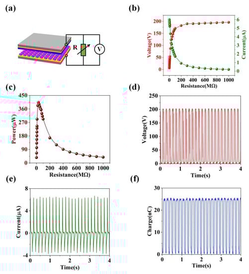 Moreover, we connect loads with different resistance values to S-TENG and measure the output performance (output voltage and current) of S-TENG, as shown in Figure 3a. The mechanical vibrator can provide an external force to drive the S-TENG. In addition, the motion parameters (such as vibration frequency and maximum separation distance) are set as 6 Hz and 5 mm, respectively. The size of the S-TENG device is about 6 cm × 6 cm. As is shown in Figure 3b, when the resistance of the load grows from 1 MΩ to 1 GM, the Voc of S-TENG will rise whereas the Isc of S-TENG will drop, which also indicates that TENG devices usually have high Voc and low Isc. Furthermore, we calculated the output power (P) of S-TENG through the relationship P = UI. In addition, Figure 3c describes the calculation results and relations. From the results, the S-TENG device can realize the maximum output power of 403.3 µW. Meanwhile, the internal resistance of S-TENG is 30 MΩ. Furthermore, the S-TENG can achieve the Voc of 198 V and Isc of 6.66 µA, respectively, as shown in Figure 3d,e. Figure 3f illustrates that the charge transfer in the external circuit can reach 25.5 nC.