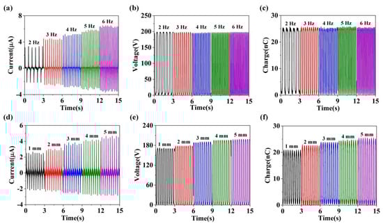 The (a) Isc, (b) Voc and (c) transfer charge of S-TENG under different operating frequencies. The (d) Isc, (e) Voc and (f) transfer charge of S-TENG under different maximum separation distance.