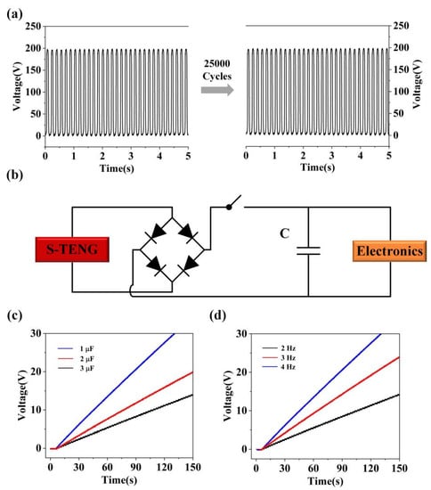 Moreover, considering the continuous work of S-TENG, we explored the electrical output of S-TENG under continuous operating conditions. Based on the results in Figure 5a, the S-TENG has good stability. Furthermore, we examine the charging effect of S-TENG with a power management circuit, as shown in Figure 5b. Here, we developed the relationship of S-TENG charging capacitors under different frequencies. Obviously, the higher the externally provided vibration frequency, the faster the rate of storing electric energy, as shown in Figure 5c. In addition, we also researched the influence of S-TENG charging different capacitors, as illustrated in Figure 5d. According to the experimental results, the larger the capacitor, the faster the charging speed.