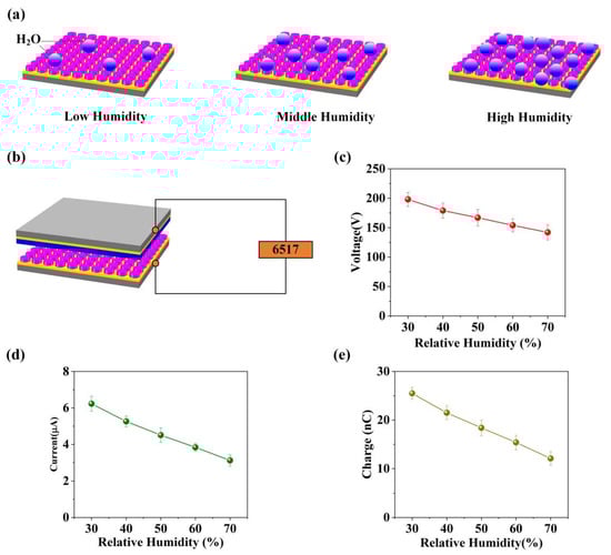 Often, TENG devices can convert moving mechanical energy into electrical energy during the contact and separation movement of triboelectric materials. In addition, the generated electrical signal is closely related to the influence of the working environment. Environmental factors will affect the electrical output signal produced by the TENG device, for example, relative humidity. It is noteworthy that sodium chloride powder has strong moisture absorption. Furthermore, this characteristic can make the S-TENG the self-powered humidity sensor by the electrical output signal change of the S-TENG device, as shown in Figure 6a,b. Specifically, the relative humidity will have a significant influence on the charge transfer of the TENG device. In this design, the sodium chloride powder plays the role of triboelectric material, and meanwhile, it is sensitive to relative humidity. Specifically, we measured the Voc, Isc and transferred charge of S-TENG under different relative humidity, as present in Figure 6c–e. According to the results, when the relative humidity rises, the electrical output (Voc, Isc and transferred charge) of S-TENG can grow, which indicates the S-TENG can monitor humidity changes.