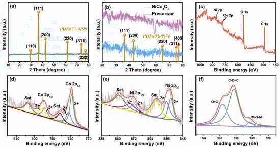 XRD pattern of (a) Cu2O, (b) Ni-Co hydroxide precursor and NiCo2O4; (c) XPS survey of NiCo2O4, (d) Co 2p, (e) Ni 2p and (f) O 1s.