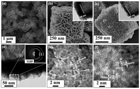 As observed in Figure 4a, the uniformly distributed Ni-Co hydroxide precursor accurately replicated the cubic structure of Cu2O templates and had an edge size of 500 nm. As shown in Figure 4b, the surface of Ni-Co hydroxide precursor was composed of a large number of interacted nanosheets and formed a network structure. In addition, the precursor displayed a cage-like structure and the shell thickness was about 200 nm. After calcination, the nanosheets on the surface became thicker, more compact and the thickness of the shell reduced to about 100 nm (Figure 4c). Notably, the crinkly nanosheets structure was clearly investigated in Figure 4d and the result was consistent with the SEM image. The SAED pattern in the insert of Figure 4d exhibited well-defined rings, revealing the polycrystalline nature of NiCo2O4 NCs. As observed in Figure 4e,f, the lattice spacing of 0.241 nm, 0.209 nm, 0.245 nm and 0.205 nm corresponded to the (111), (200), (311) and (400) planes of spinel NiCo2O4, respectively. The results were consistent with the XRD analysis and a previous report [22]. On the basis of the above discussion, NiCo2O4 NCs were constructed by the combination of the CEP method and post calcination. The highly porous structure provided sufficient active sites and mass transport channels, which are beneficial for electrocatalytic kinetics, leading to high electrocatalytic activity [23,24].