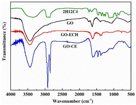 2.2.2. Preparation of 2-(Hydroxymethyl)-12-Crown 4-Ether Graft Modified Graphene Oxide (GO−ECH−CE)