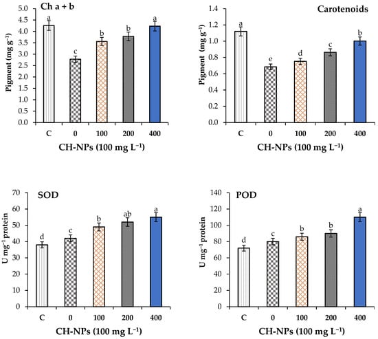 Effect of chitosan nanoparticles (CH-NPs) on photosynthesis pigments (Chl (a + b) and carotenoids) and antioxidant enzymes superoxide dismutase (SOD) and peroxidase (POD) of banana plants exposed to cold stress (5 °C for 72 h). C = control treatment without cold stress and without CH-NPs amendment. Different letters refer to significant differences between treatments according to Tukey test at p < 0.05. Each value is the mean of five replicates (mean ± SD, n = 5).