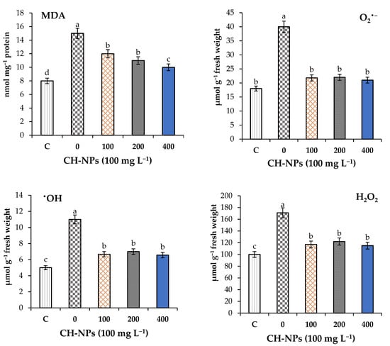 Effects of chitosan nanoparticles (CH-NPs) on malondialdehyde (MDA) and reactive oxygen species (superoxide anions (O2•−), hydroxyl radicals (•OH), and hydrogen peroxide (H2O2)). C = control treatment without cold stress and without CH-NP amendment. Different letters refer to significant differences between treatments according to Tukey’s test at p < 0.05. Each value is the mean of five replicates (mean ± SD, n = 5).