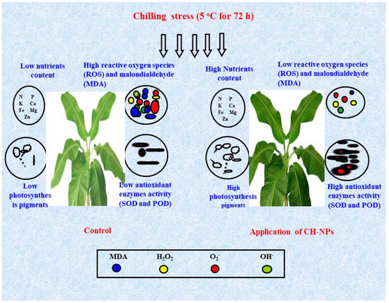 In the current study, we hypothesized that CH-NPs would increase the efficiency of banana plants in the face of cold stress by reducing the accumulation of reactive oxygen species and, in consequence, the degree of oxidative stress. The mechanisms behind this response seem to involve the stimulation of the activity of antioxidant enzymes and non-enzymatic antioxidants (phenolic compounds). The accumulation of osmoprotectants (soluble carbohydrates, proline, and amino acids), on the other hand, contributed to enhancing the plants’ resistance against chilling stress. In addition, the CH-NPs maintained a balance between nutrients and protection of photosynthesis pigments. The findings of the present study demonstrate that nutrient content, photosynthesis pigments, and antioxidant enzyme activities were significantly increased by the foliar application of CH-NPs; on the other hand, ROS and MDA were significantly decreased (Figure 4). The positive impacts of CH-NPs in reducing biotic and abiotic stresses have also been mentioned in other studies; e.g., Sen et al. [24], Zhang [25], and Sathiyabama and Manikandan [46].