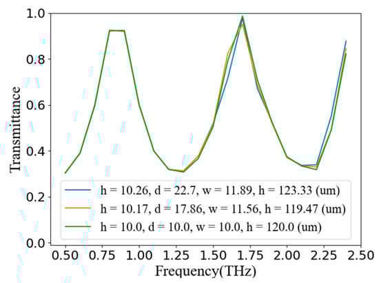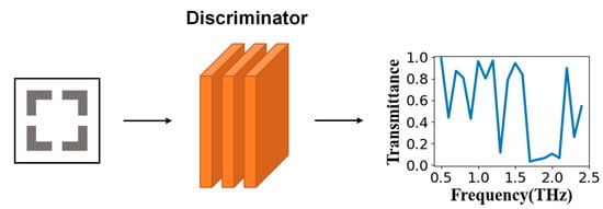 As shown in Figure 2, the discriminator could output the corresponding frequency-transmittance curve by inputting different structural parameters. The well-trained discriminator could obtain the corresponding relationship between the structure parameter and the frequency-transmittance curve. The process of obtaining the frequency-transmittance curve through the trained discriminator took a very short time, and it could be used alone to replace the time-consuming simulation process. Using COMSOL Multiphysics to simulate the single set of structural parameters of the above-mentioned square split resonator ring took about 1 h, while the time for using this network to predict the transmittance curve was only tens of milliseconds. This also allowed the trained discriminator to intuitively reflect the training results of the generator, which had a significant effect on subsequent network optimization and verification.
