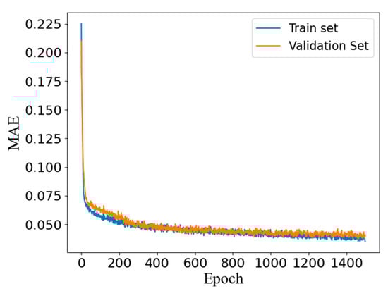 After the discriminator had been trained, there was an obvious overfitting phenomenon, which showed that the error on the verification set was far larger than the error on the training set. This reduced the generalization performance of the discriminator, and the discriminator could not be further trained. After the regularization coefficient λ had been set to 1 × 10−4, the overfitting phenomenon was effectively alleviated. In the end, the discriminator reached the optimum after 1500 epochs of training, showing close errors on the training set and the validation set (MAE = 0.033), as shown in Figure 8.