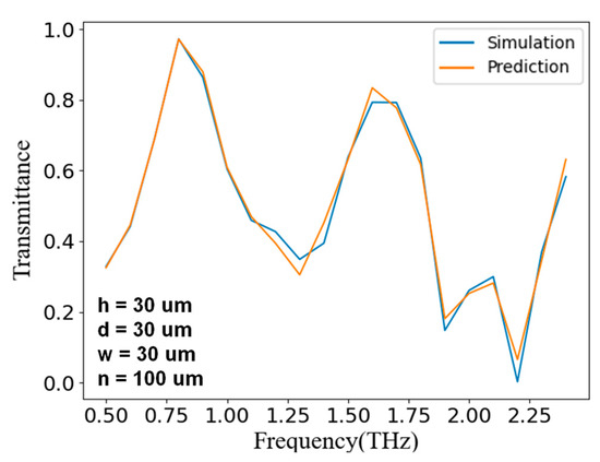 As shown in Figure 9, when we entered the structural parameters shown in the lower left corner to the discriminator, the network output frequency-transmittance curve basically coincided with the simulation result. With this as proof, our discriminator was able to accurately predict the frequency-transmittance curve that the input structural parameters could represent, and the positions and sizes of the peaks and valleys were highly consistent, which achieved the expected purpose. Although there was still a subtle error in the details, it was already within an acceptable range. Using this trained discriminator could effectively guide the training of the generator.
