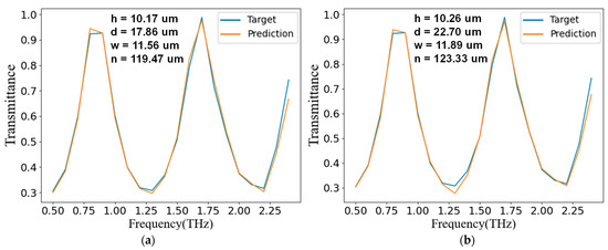 Considering that it was difficult to manually draw a set of frequency-transmittance curves that could be achieved by this structure, we selected a set of frequency-reflectance curves in the verification set as the target curve during verification. It is worth noting that this set of curves was not included in the training set, so it was not used when training the network. As shown in Figure 11, when inputting the target curve with two different sets of noise into the generator, the generator could predict two different sets of structural parameters, and both could reach the optical response reflected by the target curve.