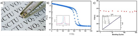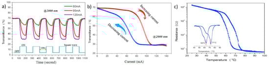 Chen et al. fabricated a flexible VO2(M) thin film on a muscovite (mica) sheet directly through RF-plasma-assisted oxide molecular beam epitaxy (rf-OMBE) [92]. First, the VO2 layer was grown using rf-OMBE on the (001) plane of mica sheets at 550 °C. Then, a layered single-walled carbon nanotube (SWNT) films was deposited using CVD on the high-quality VO2/mica thin film. The SWNT layer exhibited superior conductivity and flexibility and can be employed as an efficient heater when a current/bias voltage is applied. The almost freestanding SWNTs/VO2/mica (SVM) film was fabricated by peeling off the thin-layered SVM film from the substrates. Two Au electrodes were deposited on the flexible SVM thin film to provide a two-terminal electrode. The MIT process of the flexible VO2(M) thin film can be easily controlled by heating SVM films with a bias current on Au electrodes, thereby enabling reversible modulation of IR transmission. When a bias current was applied, the transmittance decreased sharply from 70% and maintained an almost constant value of approximately 30% thereafter. When the input current was turned off, the transmittance quickly returned to its highest value of 70%; this confirms that direct modulation of the transmittance by applying a current is possible (Figure 4a,b). The MIT temperatures were 71 and 62 °C during the heating and cooling cycles, respectively (Figure 4c). Such ultrathin flexible SVM films with superior flexibility and transparency can be used for various applications involving future electrical devices.
