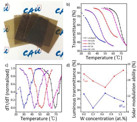 (a) Photograph of VO2(M) thin films on PET substrates for various W doping concentrations; (b) Temperature dependence of transmittance; (c) First derivatives of transmittance; (d) Luminous transmittance (Tlum) and solar modulation ability (ΔTsol) of VO2(M)/mica thin films under various W doping concentrations (1900 nm). Reproduced with permission from [74]. Copyright 2021, Elsevier.