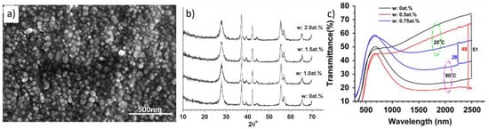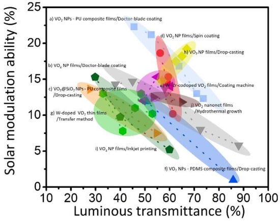 where Φsol denotes the solar irradiance spectrum for an air mass of 1.5, which is equivalent to the presence of the sun at an angle of 37° from the horizon [37]; moreover, Tsol,low temperature and Tsol,high temperature represent the solar transmittance of VO2 films at a low temperature in the monoclinic phase and at a high temperature in the rutile phase, respectively. Tlum should be greater than 40% to indicate the requirement for daylight across windows, and ΔTsol should be sufficiently high, at least 10%, for energy saving [39]. Furthermore, the phase-transition temperature of VO2 (Tc = 68 °C) should be reduced from 68 °C for efficient regulation of solar energy during daytime [40]. Therefore, a reduced phase-transition temperature (Tc), high luminous transmittance (Tlum), and strong solar-energy modulation ability (ΔTsol) are important characteristics for energy-efficient smart windows. To fulfill the demand for practical applications of energy-saving smart windows, VO2-based thermochromic thin films should possess the following features: the phase-transition temperature (Tc) should be reduced to near-ambient temperature, and a high luminous transmittance (Tlum > 40%) accompanied by a strong solar-energy modulation ability (ΔTsol > 10%) should be available [41,42].