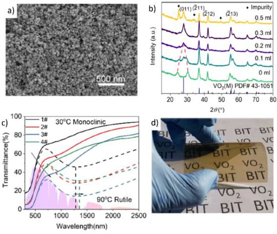 (a) SEM image of the VO2 NPs with 0.2 mL of H2O2, (b) XRD patterns of as-synthesis VO2 NPs with different amounts of H2O2, (c) temperature-dependent transmittance spectra of samples at 30 °C (bold line) and 90 °C (dashed line), and (d) the VO2(M) NPs-based flexible films. Reproduced with permission from [77]. Copyright 2018, American Chemical Society.