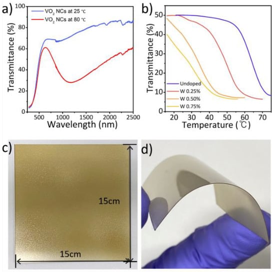 Kim et al. demonstrated single-step hydrothermal synthesis of VO2(M) NPs using phase-pure vanadium precursors [136]. After mixing the vanadium precursors, size-selective purification was performed to enhance the phase purity of the precursors, resulting in the formation of VO2(M) NPs with enhanced optical properties. The obtained phase-pure VO2(M) NPs exhibited an enhanced Tlum (55%) and ΔTsol (18%), and the ΔTsol value is one of the highest reported for hydrothermally synthesized VO2(M). Furthermore, W-doped VO2(M) NPs have been reported to exhibit superior phase-transition behaviors, while Tc is systematically reduced depending on the W doping concentration (Figure 11a,b). Flexible VO2(M) films were fabricated and deposited on PET polymer substrates over a large area using a spray coater (15 cm × 15 cm) (Figure 11c,d). In model house experiments under daytime solar irradiation, the W-doped VO2(M) films applied onto glass provided a significant reduction in the indoor temperature; thus, these films are potentially viable for practical applications.