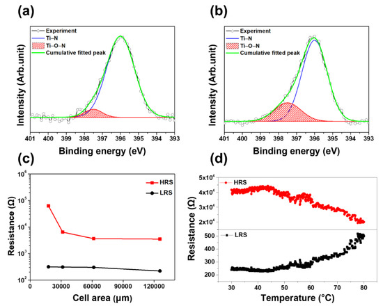 The PCMO film deposited at 100 mTorr OP was analyzed at the PCMO/TiN interface by using XPS to investigate the effect of the OVs on the switching properties of the PCMO film. Figure 2a,b display the spectra of XPS N1s obtained from this PCMO film in the high-resistance state (HRS) and low-resistance state (LRS), respectively. A high-intensity Ti–N peak, originating from the TiN electrode, was observed at 396 eV for the PCMO film in the HRS (Figure 2a). Moreover, a low-intensity peak corresponding to the Ti–O–N bonding was observed at 397.5 eV. This peak resulted from the bonding between the oxygen ions and the TiN, indicating the presence of a very small number of oxygen ions in the TiN electrode in the HRS. However, the XPS analysis of the PCMO film in the LRS showed an intense Ti–O–N peak (Figure 2b), implying that a large number of oxygen ions migrated into the TiN bottom electrode during the set process. Moreover, the OVs, which were generated in the PCMO film during the set process, were considered to form the conducting OV filaments in the PCMO film. The PCMO films formed at 200 and 300 mTorr OP exhibited similar results (Figure S2c,d). Figure 2c displays the variation in the resistance of the PCMO film deposited at 100 mTorr OP in the HRS (RHRS) and LRS (RLRS) with respect to the size of the top electrode of the PCMO memristor. The value of RHRS decreased as the size of the top electrode increased, suggesting that this current might be explained by a mechanism related to the interface of the electrode/PCMO film or the PCMO film [39]. On the contrary, the resistance of the PCMO film in the LRS did not change as the size of the top electrode increased (Figure 2c). Therefore, the current in the PCMO in the LRS can be explained by the presence of conducting OV filaments formed during the set process. Furthermore, the currents in the PCMO memristors in both the LRS and HRS can be explained by Ohmic conduction and space-charged-limited-current (SCLC), respectively, as displayed in Figure S3a–c. The SCLC mechanism was previously used to explain the current of the HRS of the PCMO film, although the OVs behaved as trap sites in the PCMO film [54]. Figure 2d exhibits the change in the resistance of the PCMO film in the HRS and LRS with respect to the measuring temperature. The resistance of the PCMO film in the HRS decreased with an increase in the temperature, indicating that this PCMO film has insulating properties [55]. These properties could be the result of the OV filaments possibly being disconnected during the reset process. However, the resistance of the PCMO film in the LRS increased with increasing temperature, implying that, in the LRS, the PCMO film has metallic conducting properties [55]. This result implies that the conducting OV filaments were connected in the LRS, inducing metallic properties in the PCMO film. Furthermore, the bipolar switching mechanism of the PCMO memristors fabricated in this study is attributed to the formation and disruption of the OV filaments. In addition, the PCMO films grown by varying the OP had excellent reliability characteristics, as shown in Figure S4a–c, indicating that these PCMO films could be utilized as a memristor.