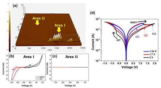 To verify the existence of the conducting OV filaments in the PCMO film in the LRS, the PCMO memristor in both the HRS and LRS was investigated using conductive atomic force microscopy (CAFM). Figure 3a exhibits a plot of the current in the PCMO memristor in the LRS obtained at 1.6 V, where the area of the PCMO film is 0.25 × 0.25 μm2. A current of approximately 8.5 nA was detected in area I, but current was not detected in area II (Figure 3a). The I–V curves were measured for areas I and II of the PCMO film (Figure 3a). A bipolar switching curve was measured for area I, as displayed in Figure 3b. However, current could not be measured for area II (Figure 3c). This suggests that the OV filaments were formed in area I of the PCMO film and behaved as a current path in the LRS. Moreover, the bipolar switching curve measured for area I of the PCMO memristor was attributable to the presence of the OV filaments in this area. Hence, it can be concluded that the switching behavior of the Pt/PCMO/TiN–Si memristor can be explained by the formation and rupture of the OV filaments in the PCMO film. Figure 3d shows the I–V plots of the Pt/PCMO/TiN memristor measured at different reset voltages (VRESET) to demonstrate the continuous change in the resistance level of the PCMO memristor. The PCMO film was deposited at 100 mTorr OP. The continuous change in the resistance is required for application as an artificial synapse [56]. Four resistance levels composed of one LRS and three HRSs were measured from the PCMO memristor. The three HRSs, namely H1, H2, and H3, were measured by using VRESET values of 1.25, 1.75, and 2 V, respectively, and these HRSs also had good reliability (Figure S4d). Furthermore, additional HRSs are considered likely to be detected by further changing the VRESET values. These results confirm that the PCMO memristor exhibits a continuous change in its resistance levels, indicating that the PCMO memristor could be employed as an artificial synapse with several synaptic weights.