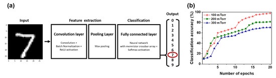 The classification accuracy is generally accepted to be related to the conduction modulation linearity [25]. Hence, the PCMO memristor, which was fabricated using the PCMO film grown at 100 mTorr OP, was expected to have improved classification accuracy. The classification accuracy of the PCMO memristors grown by varying the OP was simulated using a CNN. The CNN model consisted of two parts, namely feature extraction and classification, as shown in Figure 6a. Feature extraction was conducted using input, convolution, and pooling layers, and the features of input images were extracted, as shown in Figure 6a. Classification was carried out by using a fully connected layer and an output layer, and the input image was classified using a neural network (Figure 6a). Details of the CNN are described in Supporting Information 7. Figure 6b shows the change in the classification accuracy of the PCMO memristors with respect to the number of epochs when the MNIST patterns were used as input. The accuracy of the PCMO memristors was enhanced and eventually saturated as the number of epochs increased. The maximum accuracy of the digit recognition for the PCMO memristor grown at 300 mTorr OP was approximately 70%, and it increased for PCMO memristors fabricated at low OP (Figure 6b). In particular, the PCMO memristor fabricated at 100 mTorr OP, which showed the best conduction modulation linearity, exhibited the highest classification accuracy of 95.85%, as shown in Figure 6b. Similar results were obtained when 5-fold cross-validation was used, as listed in Table S1. Therefore, the classification accuracy of an artificial synapse could be concluded to improve as the conduction modulation linearity increases. In addition, the PCMO film grown at 100 mTorr OP also exhibited reliable multistate retention of the transmission curve, as shown in Figure S6c.