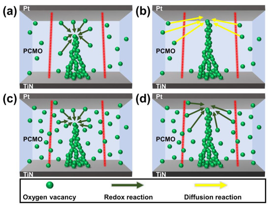 Because the switching properties of the PCMO memristor are related to the OV filaments, the change in the conductance of the PCMO memristor can be described by the change in the size of the OV filaments. The conduction range of the potentiation and depression curves corresponds to the HRS in the PCMO films. Hence, the variation in the conductance in the potentiation (or depression) curve can be described by the change in the length of the OV filaments in the PCMO film. According to previous studies, the growth (or shrinkage) of the OV filament could be explained by two reactions: the redox reaction (fast reaction) and oxygen ion diffusion (slow reaction) [18,26,29,30]. Parts I and II in the potentiation (or depression) curve were described by the redox reaction and oxygen diffusion process, respectively [18]. Moreover, it has been suggested that the linearity of the conduction modulation can be enhanced when the change in the size of the filament is mainly determined by one of these processes [18,26,29,30]. A small number of OVs existed for the PCMO film grown at 300 mTorr OP, as shown in Figure 7a. When P-spikes were applied to the PCMO memristor, OVs near the OV filament joined the OV filament through the redox process, triggering an abrupt increase in the current (part I in Figure 5a). However, these OVs were soon depleted as only a small number of OVs existed near the OV filament. Hence, the OVs further from the filament diffused into the filament and contributed to the increase in the filament size (Figure 7b). In this instance, the growth of the filament was controlled by the diffusion of OVs, which slowly increased the current (part II in Figure 5a). Therefore, the growth of the OV filaments in the PCMO film grown at 300 mTorr is controlled by two mechanisms, redox reaction and OV diffusion process, leading to nonlinear conduction modulation in the potentiation curve, as shown in Figure 5a. The shrinkage of the filaments in the PCMO film grown at 300 mTorr OP is also controlled by two mechanisms. Hence, the nonlinear conduction modulation was also observed in the depression curve (Figure 5a).