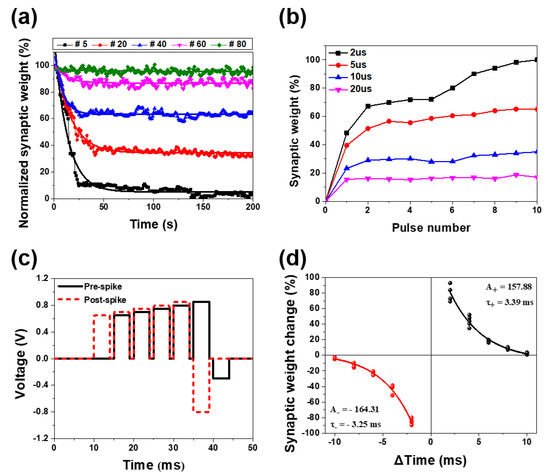 where C+ and C− are constants, τ+ and τ− are time constants, and ΔW0+ (or ΔW0−) is ΔW at infinite Δt (or −Δt). The STDP data of the PCMO memristor were well fitted by Equation (1), as shown in Figure 8d, and the values of C+/C− and τ+/τ− were determined as 157.9/−164.3 and 3.4 ms/3.3 ms, respectively. This result confirms that the STDP of a biological synapse is well emulated in the PCMO memristor. The results presented above show that the PCMO memristor can mimic several of the biological synaptic properties, and the memristor also exhibits good conduction modulation linearity. The PCMO memristor fabricated at low OP of 100 mTorr is therefore concluded to be a promising artificial synapse. In addition, the device size and HRS current of the PCMO film developed in this study are relatively large compared to those of the commercial device. However, the size and thickness of the PCMO film in PCMO devices can be readily reduced when produced by a semiconductor company, since the device has a very simple structure (Pt/PCMO/TiN–Si) and fabrication process, including a low growth temperature of 300 °C. Moreover, the linearity of the conduction modulation is readily achieved in a small PCMO device as it is obtained by controlling the OP during the growth of the PCMO film. Therefore, the miniaturization and conduction modulation linearity of the PCMO device are readily achieved.