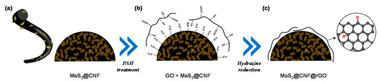 For rGO coating on the MoS2@CNFs, the surface of MoS2@CNFs was modified using poly(allylamine hydrochloride) (PAH) [7,23,24]. Firstly, the MoS2@CNFs were dipped in PAH solution; the surface functional group changed from the hydroxy surface group to the amine group (-NH2) (see the details in the Materials and Methods section). The PAH-modified MoS2@CNFs have positively charged amine functional groups (NH3+) exposed on the surface. On the other hand, the GO has functional groups of the carboxyl group (-COOH) and hydroxy group (-OH), attributed to the negative charge of GO in the aqueous solution. The GO flakes were quickly attracted to the surface of PAH-modified MoS2@CNFs due to the electrostatic self-assembly (Figure 1b). Then, the GO was chemically reduced by hydrazine treatment, which rendered the strong chemical bond between the amine functional group and oxygen group with the ring-opening reaction. Finally, the GO changed to rGO, covering the entire surface of MoS2@CNFs (Figure 1c).