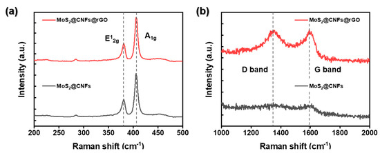 Results of Raman analyses of MoS2@CNFs and MoS2@CNFs@rGO with different ranges: (a) 200~500 cm−1, (b) 1000~2000 cm−1.