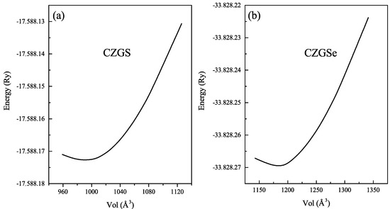 Before starting the analysis of the results, we draw attention to the stable crystal structure of CZGX (X = S, Se) presented in Figure 1 [43]. The relaxed lattice parameters of CZGX (X = S, Se) were acquired by fitting the total energy as a function of the volume of the unit cell using Murghan’s equation of state [44]. The Figure 2 presents the fitted data of total energy to unit cell volume. Thus, the optimization process leads to the following equilibrium parameters (a, c) (5.28, 10.515 Å) for CZGS and (5.58, 11.11 Å) for CZGSe, which are consistent with other theoretical and experimental works [45]. Table 1 compares our obtained calculations of lattice constants, band gap energy, static dielectric constant and the refraction index with some theoretical and experimental works from the literature.