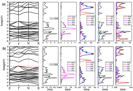 First, we investigated the band gap energy for both two kesterite compounds with mBJ + U calculations. Figure 3 gives an overview of the band structure a) for CZGS material and b) for CZGSe. As can be seen from this figure, the valence band maximum (VBM) and the conduction band minimum (CBM) are located at the point of the first Brillouin zone for both materials, which means that the two materials have a direct band gap. We note that the addition of the Hubbard potential leads similar behaviour of the band gap, as reported by [45]. The values of the band gap energy were about 2.05 eV and 1.26 eV for CZGS and CZGSe, respectively. These values are close to the experimental measurments reported by Reference [27]. For more details on the origin of the electronic band structure, the corresponding partial and total density of states are also presented in Figure 3. The band within the range from −6 to −4 eV in the valence band is a hybridization between the s-orbital of Zn and p-orbitals of S/Se and Ge; meanwhile, the bands near the Fermi level are dominated by Cu-d orbitals with a little contribution from p-orbitals of S/Se and Ge. On the other side of the band structure, the bottom of the conduction band is essentially formed from the s-Ge and p-S orbitals; the rest of the conduction band is a coupling between p-Ge and s-Zn orbitals.